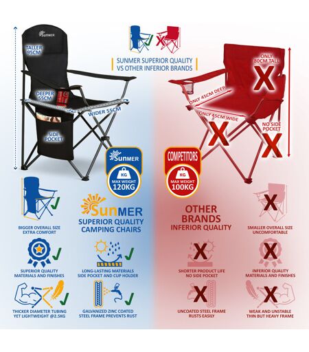 SUNMER Folding Camping Chairs - Extra Wide Black 95cm H X 55cm W X 55cm D