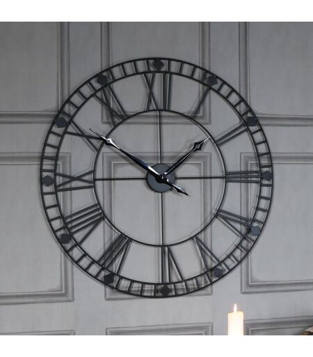 This Large Black Iron Skeleton Wall Clock 88cm x 88cm would make a simple yet stylish wall decor choice for fans of vintage design and black decor. Made of iron this clock has a classic round design with roman numerals and matching black time hands. It is battery powered and can be wall mounted via a hook on the back. A striking clock perfect for placement in a living room hallway or kitchen space. Due to its traditional design and black finish this clock could blend into modern industrial or vintage inspired spaces. This clock is available in other colours and sizes. Requires x1 AA battery This will make a striking focal point. This clock will easily fit into both modern and traditional style interiors. This clock is a great addition to our fantastic range of skeleton style wall clocks. Fabulous designs that are simply but incredibly stylish and a must have for your home. Want to see more items like this? Browse our Clocks category for more options. Colour: Black Material(s): Iron 88cm x 88cm x 2cm (width x height x depth) Fully assembled From the timepieces collection this imposing Wall Clock is made from iron painted black and with Roman numerals. It is skeletal in styling and would make a fine statement for the room where you use it It needs one AA battery to operate it. It is 88 cm in diameter and 3cm deep ...
