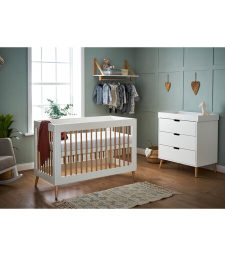 The range is inspired by Scandinavian design, featuring a clean-cut finish and two-tone colourway, making it the perfect addition for families looking to create a modern and stylish nursery. The mini 2 piece room set consists of the mini cot bed and changing unit. Featuring the same aesthetic and high-quality finish of the regular-sized cot bed, the mini cot bed means families with a more compact nursery do not have to compromise when looking for a space-saving alternative. The top position of the three height-adjustable mattress base allows you to put down your baby with less pressure and strain applied to your back and as they develop and find their feet, you can maintain their safety by lowering the base. When your little one is ready to begin their transition, the included safety rail will provide reassurance and familiarity during an often daunting time and once they are used to their “big bed” this can be simply removed to create a stylish toddler bed. The mini cot bed requires a mattress, available separately. The changing unit is the perfect storage companion, featuring three 34L capacity drawers with recessed handles that enable you to easily put away and quickly locate your little one’s belongings. Obaby ...