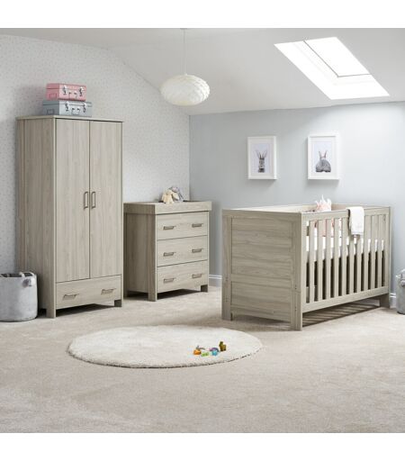 A contemporary design, due to its clean lines and textured oak effect finish, will fit perfectly in today’s modern nursery. This 3 piece room set consists of a cot bed, changing unit and double wardrobe. The cot bed has three mattress base positions, the highest allowing you to put down and pick up your newborn without straining your back through unnecessary bending. As your little one starts to develop and become more active, the mattress base can then be lowered by a further two positions keeping them safe and secure at all times while the teething rails protect their delicate first teeth. When your little one is standing confidently, this can be easily transformed into a stylish toddler bed that still offers the familiarity they are used to and helps them to transition in an often-daunting time. Once transformed the toddler bed can be used until they are approximately four years old. All three drawers feature two brushed metal handles and glide on smooth runners allowing you to easily open them with either hand. Discreet spring pins allow the changing area to be attached to the top of the unit without any unsightly screws showing. When the changing area is no longer needed the frame can be easily removed to create a solid top chest of drawers. Stylish brushed metal handles are used throughout the piece making sure it is simple to use. For those parents looking for extra storage, this cot bed under drawer features a 56.64L capacity that allows you to keep your little one’s things tidy and close to hand without taking up valuable space elsewhere. The stylish brushed metal handles and sturdy wheels make the drawer simple to use on any surface. Obaby ...