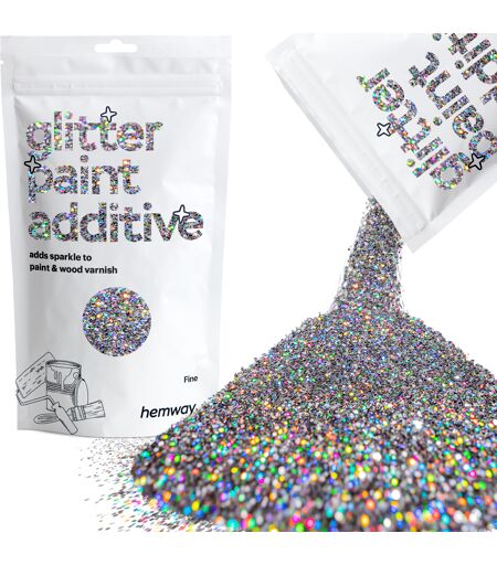 Introduction Add a sleek touch to your walls with our gun metal grey holographic glitter for wall paint. The advanced light-reflective technology in our glitter paint additive ensures a sleek, multi-dimensional effect. Additionally, it provides a durable, fade-resistant glitter finish to a variety of surfaces with this versatile paint glitter. The tiny, shimmering glitter particles capture and reflect light, creating a beautifully sophisticated yet enchanting shimmer. DISCLAIMER: Colours may vary in different lighting conditions. Open the tabs below for more information. Description Using this glitter for wall paint is simple and effective. Just add the glitter to any emulsion, acrylic, or latex paint. Start by opening the 100g / 3.5oz packet, then pour it into 1L / 34fl oz of paint, stir thoroughly, and apply. Our glitter paints are not only colourfast and UV-resistant but also heat and solvent-resistant, non-toxic, vegan, cruelty-free, and incredibly easy to use. Moreover, the vibrant colors will not fade over time, ensuring their brilliance remains. For the best results, we recommend using Hemway buffing pads for your glitter paint project. Once your paint glitter for walls has dried, gently rub with a buffing pad to release an abundance of sparkles. Thus, our wall paint additives help create a distinctive, enviable look for your home, blending super sparkle with a colorful finish. Additionally, our paint additive crystals are temperature-resistant and waterproof, guaranteeing longevity and durability. What is Holographic Glitter? This is a special type of glitter that reflects light in a rainbow spectrum, creating a shimmering, multi-colour effect that changes depending on the angle of the light and the viewer’s perspective. Unlike regular glitter, which reflects light in a single or limited range of colours, holographic glitter has a prismatic or iridescent finish that gives it a more dynamic and eye-catching appearance. Recyclable Our commitment to sustainability is visible in our packaging and products. They are fully recyclable or made from recycled materials, including: Delivery Boxes Labels Pulp Fittings We focus on lowering our environmental impact with sustainable packaging choices. Vegan & Cruelty-Free Our glitter for wall paint is proudly vegan & cruelty-free. Most Hemway products are meticulously crafted to be vegan and cruelty-free. Because of this, they contain no animal-derived ingredients and are never tested on animals. This dedication ensures that our entire range adheres to ethical standards. As a result, we provide consumers with eco-friendly and humane options for all their crafting and DIY needs, making responsible choices accessible and stylish. How To Use Hemway's glitter for wall paint is as easy to use as it is to love. To use, simply pour the glitter for wall paint into your water-based paint at a ratio of 100g / 3.5oz per 1 Litre / Quart Gallon. For optimal results, we recommend using Hemway Interior Acrylic Paint... ...