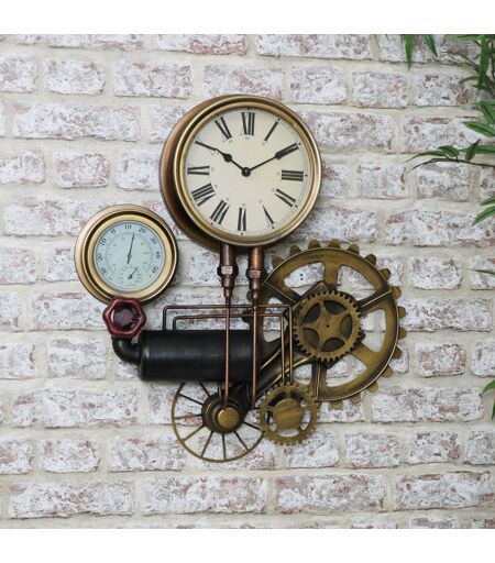 This Large Industrial Pipe Clock is a quirky piece of wall decor for fans of eclectic design and industrial inspired accessories. Made of metal glass and plastic this clock has a black brass and copper colour finish. It consists of a round clock with black roman numerals brass metal cog detailing black pipework and an imitation pressure dial. This stylish wall clock would create a quirky feel to any living room hallway or office space. Due to its rustic look it could easily blend into industrial rustic or eclectic style spaces. This clock can be wall mounted via hooks on the back. Part of a large collection of Clocks available in a wide selection of styles sizes and colours. Want to see more items like this? Browse our Clocks category for more options. Colour: Brass Black Copper Material(s): Metal Glass Plastic 53cm x 48cm x 10cm (height x width x depth) Fully assembled ...
