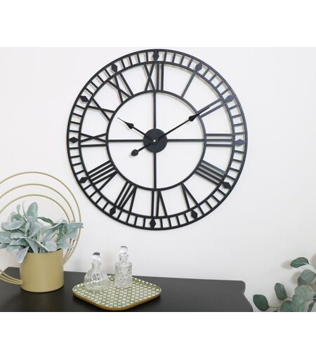 This Black Metal Skeleton Clock is a classic wall decor choice ideal for fans of black decor. Made of metal this clock has a round design with a simple black finish. This design includes roman numerals and matching black metal timehands. An stylish wall clock for placing in a hallway living room or dining room space. Due to its timeless design and black finish this clock will blend into modern vintage or industrial inspired rooms. This clock is also available in other sizes and colours. Part of a large collection of Clocks available in a wide selection of styles sizes and colours. Want to see more items like this? Browse our Clocks category for more options. Colour: Black Material(s): Metal 60cm x 60cm x 3cm (width x height x depth) Fully assembled ...