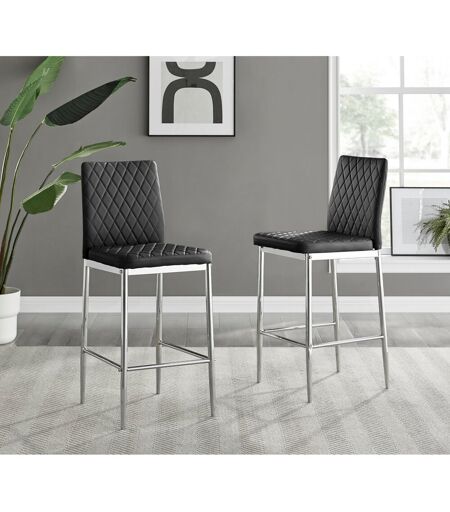 Our Milton faux leather bar stools are sleek and elegant, perfect for any kitchen dining space. The tall industrial-style legs offer a strong base and the comfortable footrest allows maximum comfort. Upholstered in faux leather and finished with diamond pattern stitching the Milton bar stools would seamlessly fit in with any home décor. The soft-touch and wipe-clean faux leather make the Milton bar stools perfect for families and dining areas whilst the stitched diamond design of the seat and back cushion adds a plush appearance to this ergonomically designed and stylish stool. Furniture Box Seat Colour: Black, Base Colour: Silver ...