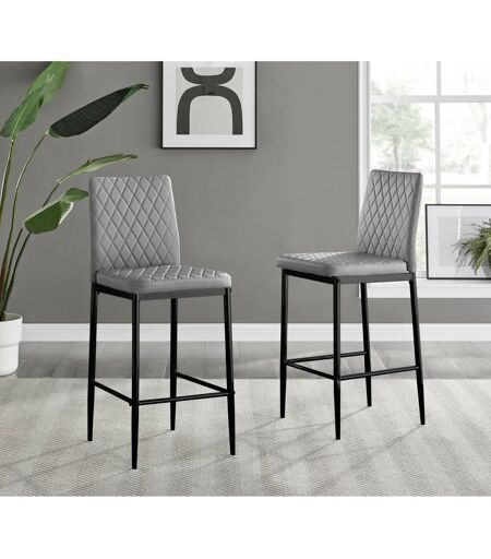Our Milton faux leather bar stools are sleek and elegant, perfect for any kitchen dining space. The tall industrial-style legs offer a strong base and the comfortable footrest allows maximum comfort. Upholstered in faux leather and finished with diamond pattern stitching the Milton bar stools would seamlessly fit in with any home décor. The soft-touch and wipe-clean faux leather make the Milton bar stools perfect for families and dining areas whilst the stitched diamond design of the seat and back cushion adds a plush appearance to this ergonomically designed and stylish stool. Furniture Box Base Colour: Black, Seat Colour: Grey ...