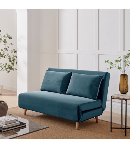 Our Brody 2 seater folding sofa bed unfolds into a double bed, perfect for extra sleeping space when you have guests! A compact and neat modern design that takes inspiration from traditional futons, and is upholstered in a gorgeous velvet fabric, the Brody is going to fit into most contemporary living rooms or bedrooms. Opens into a single bed using a smooth fold-out click-clack mechanism. Constructed around a sturdy timber frame and sitting on wooden legs for an elegant look. Comes with a free matching scatter cushion. A practical and stylish addition to your home. Our Brody sofa bed has been designed with super simple and quick assembly in mind. Minimal parts and fixing with easy-to-follow instructions means it can be up and ready without hassle. Available in a choice of colours and fabrics. Furniture Box Body Fabric: Blue Velvet ...