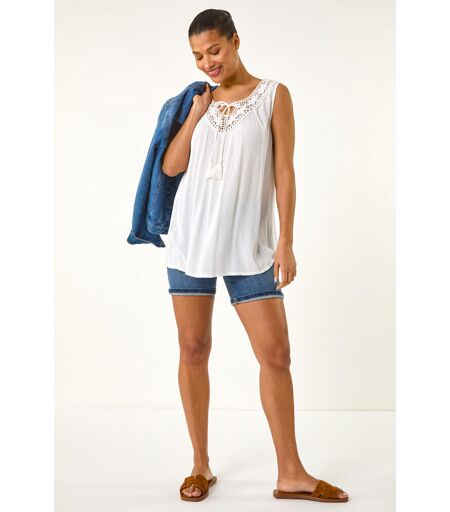 Embroidered Tie Neck Vest Top by Roman UK Express your fashion flair with this embroidered tie neck vest top perfect for the Spring Summer season This trendy top features a tie front neckline detail and airy sleeveless style all crafted from a comfortable woven fabric The trim embroidery lace detail adds an extra touch of elegance finishing off the look in a flattering vest shape For a stylish look pair it with a denim jacket and jeggings thats perfect for any casual occasion Womens Regular fit True to size 100 Viscose Lace 100 Cotton Machine Washable 100 Viscose ...