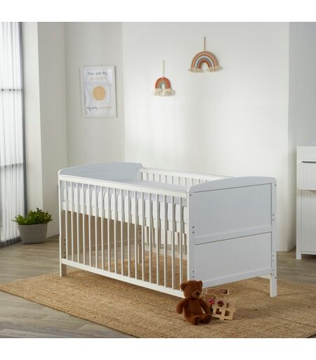The Cot Bed is crafted from solid pine wood. With its sturdy design and three position base it is the perfect starter cot for your precious little one. It has smooth side rails, a contemporary New England style design on the head and the option of three base height positions. It also comes with teething rails for that added protection. The cot is long lasting - it also converts into a junior bed and is suitable from birth up to 3 years. Kinder Valley Finish: White ...