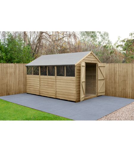 This garden shed helps to keep your garden clutter-free and offers a secure space for you to store garden equipment. With generous headroom, you can move around easier and store more. The shed's improved design features smaller sections which make it easy to handle and easy to assemble. The shed has been constructed using straight cut boards that overlap which aids water run-off and allows natural movement of the timber so it can adapt to the changing weather conditions. It is ideal for storing heavier gardening equipment and supporting shelving. The 6 fixed windows are made from shatterproof PET glazing which will not become yellow or brittle over time. This garden shed is made up of modular sections where same size panels are interchangeable means you can also choose which side the window panel goes during assembly, or move the window panel forward or backwards. With more timber and additional framing, this garden shed also features an additional metal roof truss bracket for increased strength. The doors are braced with strong double “Z” framing and secure hidden hinges, fitted with a hasp and staple latch for increased security. The black sand felted roof, smooth-planed barge board and finial give this shed an attractive finish. This great value garden shed comes with all fixtures, fittings and instructions which are easy to follow. Forest Garden Installation Included: No ...