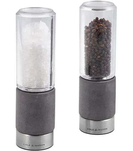 Inspired by modern, urban British architecture, this sleek and stylish Cole & Mason Regent Stemless Mills Concrete Gift Set, makes a fantastic addition to any contemporary home. This salt and pepper mill set combines acrylic and concrete to make a modern and tactile table centre piece. Featuring the Cole & Mason Precision+ mechanisms; carbon steel for pepper that strips peppercorns instead of crushing them, and diamond-sharp ceramic for salt, ensuring maximum flavour release from every turn. The hardwearing qualities of these mechanisms ensure you will always receive a consistently outstanding performance. The clear acrylic top contrasts well with the smooth dark grey concrete base which has been finished with a clear protective lacquer to prevent marking. The simplicity of the shape allows the minimalist qualities of the materials to stand out. To clean, simply wipe with a damp cloth and use a clean cloth to dry. Cole & Mason Regent Stemless Mills Concrete Gift Set, is covered by a lifetime mechanism guarantee. Cole & Mason Regent Stemless Mills Concrete Gift Set is supplied partially filled. ...