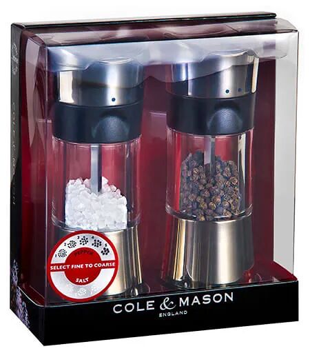 As the name suggests, the Cole & Mason Horsham Inverta Salt & Pepper Mill Gift Set sits 'upside-down' on the table to keep things nice and tidy. The modern design and chrome and acrylic materials give these mills a contemporary styling that will look good in any kitchen or dining room. The pepper mill has five grind settings and the salt mill has three grind settings. The high quality grind mechanisms (carbon steel in the pepper mill, ceramic in the salt mill) come with a lifetime guarantee. ...