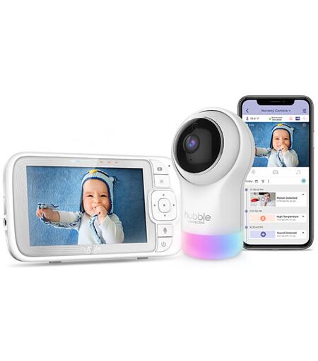 The Hubble Nursery Pal Glow+ 5 inch Baby Monitor is finished in white can track room temperature, pan, tilt and zoom and recognise small movements thanks to the infrared night light. The rechargeable battery has a life up to 15 hours and provides a crystal clear view on the 5 inch LCD monitor at all times. The Hubble monitor can soothe baby with preinstalled nature sounds, lullabies and bedtime stories or calm them with your own voice with the 2 way communication. There is also a built in ambient night light that can help to soothe your baby with a range of 7 soft colour glows. The Hubble Pal can be connected to your smart devices which will then send notifications of movements and sounds so you can stay connected. The range of the camera and the monitor is 300 meters and can move around the house with you. ...
