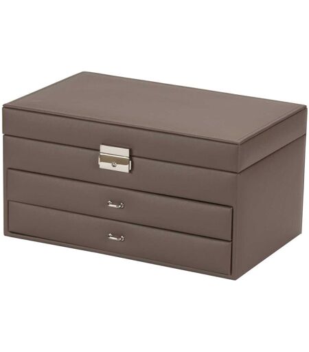 Mink bonded leather rectangular jewel case. Rectangular jewel case with two drawers. The top section includes a mirror to the lid interior, an elasticated pocket, earring straps, ring rolls, and compartments. Fully lined with mocha velveteen. Silver-tone fittings. Lockable. Mele&Co ...