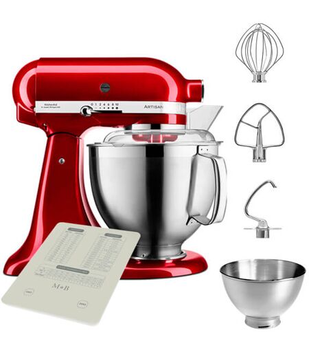 FREE Mary Berry At Home Digital Scale Worth £24.95 The stunning KitchenAid 5KSM185 Artisan 4.8L Stand Mixer, finished in candy apple, features the characteristic sweeping lines that make this a true kitchen icon. Combine this with its tough, die-cast zinc construction and powerful (0.19 HP) direct drive motor and you have what could be classed as a thoroughbred workhorse in the kitchen. The planetary action of the Artisan mixer moves the mixer head clockwise and the shaft counter-clockwise, moving the beater to the edge of the bowl at 67 different points for fast and thorough mixing, eliminating the need to rotate the bowl. To add to the KitchenAid mixer's versatility is the multi-purpose attachment hub which allows you to attach a wide range of accessories. The 5KSM185 Artisan Mixer is supplied with a comprehensive range of accessories including: 4.8L STAINLESS STEEL BOWL - with an updated design this stylish bowl, made from polished stainless steel, can process up to 1kg of all-purpose flour, 12 egg whites, 2.7kg of cake mix, 2kg of bread dough or 1L of whipped cream. Dishwasher safe. 3L STAINLESS STEEL BOWL - an additional bowl is handy so you don't have to wash up between mixes. Dishwasher safe. POURING SHIELD - allows you to add ingredients to the bowl without splashing. STAINLESS STEEL WIRE WHISK - perfect for adding air into egg whites, cream and dips. Dishwasher safe. STAINLESS STEEL FLAT BEATER - use when mixing heavier mixtures such as cake mix, cookie dough and mashed potato. Dishwasher safe. STAINLESS STEEL DOUGH HOOK - for kneading bread, pizza or pasta dough. Dishwasher safe. Each KitchenAid 5KSM185 Artisan Mixer is supplied with a five year KitchenAid guarantee. ...