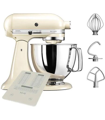 FREE Mary Berry At Home Digital Scale Worth £24.95 The KitchenAid KSM125 Artisan 4.8L Tilt-Head Stand Mixer finished in Almond Cream. The instantly recognisable design of the KitchenAid Artisan Mixer can truly be described as iconic. The sweeping curves and rounded head give it a presence in the kitchen that other mixers can only dream of. It's not all about the looks with this mixer though. Its full metal construction is robust and stable and the direct drive motor provides plenty of power to the attachments or accessories. The stand mixer's original planetary action eliminates the need to rotate the bowl by spinning the beater clockwise and the shaft counter-clockwise, moving the beater to the edge of the bowl at 67 different points. A wide range of attachments are available for the KitchenAid Artisan mixer, taking it way beyond being just a mixer. These are easily attached via the multi-purpose attachment hub. The KitchenAid KSM125 Artisan mixer comes with these standard accessories in the box: 4.8L STAINLESS STEEL BOWL - can process up to 12 egg whites and 1kg of flour. WIRE WHISK - for whipping up light and airy meringues and cream. DOUGH HOOK - for kneading dough. FLAT BEATER - general purpose mixing beater. For peace of mind the 4.8L Artisan tilt-head mixer comes with a 5 year KitchenAid warranty. ...