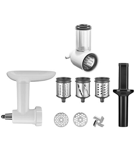 This KitchenAid Stand Mixer Attachment Set includes the following: Food Grinder, Fruit and Vegetable Attachment, Fresh Prep Slicer/Shredder Attachment. The KitchenAid Food Grinder Attachment boasts an improved design, it transforms ingredients for wholesome and fresh recipes. From raw meat to vegetables, this attachment provides a quality, easy and fast grind. Supplied with fine and coarse grinding plates. Fruit and vegetable strainer accessory - Designed to work with the food grinder attachment. Helps to create delicious homemade sauces, jams, baby food and much more. This accessory will remove any peels, resulting in puréed fruits or vegetables. Fresh Prep Slicer/Shredder Attachment - supports easy and fast slicing and shredding, of ingredients such as cucumbers, cheese and even vegetables. Supplied with three quick-change blades. The 2 in 1 food pusher provides ideal slicing and shredding performance. Designed to tackle both large and small diameter fruits and vegetables. Standard Parts for the Food Grinder Attachment include: - Improved food grinder attachment design - Stainless Steel Knife 4.5mm Fine Grinding Plate -6mm Coarse Grinding Plate -Food Pusher. Improved food grinder attachment is suitable for hand washing. For a quality grind for everything from vegetables for salsa to raw meat for mince to create handmade burgers. The stainless steel knife processes soft and hard ingredients. Use the Fine (4.5mm) grinding plate on ingredients such as cooked meats, hard cheeses like parmesan and to create breadcrumbs. The Coarse (6mm) grinding plate makes light work of grinding raw meats, vegetables for sauces and salsa. Use the food pusher to push easily any kind of food into the feed tube and towards the knife and plates. Dishwasher safe parts: Food pusher, removable tray, large grind worm, strainer cone and strainer tray. Standard parts for the Fresh Prep Slicer/Shredder Attachment: - 2-in-1 foo d pusher - Body of the fresh prep slicer/shredder - 3mm Slicing Blade - 4mm Medium Shredding Blade - 6mm Coarse Shredding Blade - Storage case. The 2 in 1 food pusher provides ideal slicing performance for both large and small diameter fruits such as cucumbers to celery. Opening of large pusher - approx 6cm. Opening of small pusher - approx 3.5cm diameter. The 3mm slicing blade quickly slices vegetables such as cucumbers, carrots, celery and zucchini. The 4mm medium shredding blade is designed for shredding ingredients such as cheese and firmer vegetables such as carrots to a finer consistency. The 6mm coarse shredding blade can handle cabbage for coleslaw or even potatoes for prepping homemade hash browns. All the shredding blades are made from stainless steel and suitable for use in the dishwasher. The KitchenAid Stand Mixer Accessory Pack is supplied with a 2 year guarantee. ...