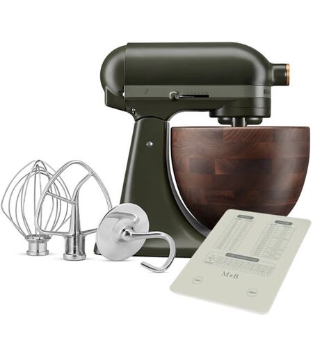 FREE Mary Berry At Home Digital Scale Worth £24.95 This unique KitchenAid Artisan 4.7 Litre Evergreen is part of the Design Series 2024. Deep forest green and a true walnut wood bowl bringing nature into every kitchen. Each bowl is one of a kind, with a wood grain design. The band and accessories hub at the front features a subtle leaf design which blends seamlessly with this nature inspired mixer. The instantly recognisable design can truly be described as iconic. The sweeping curves and rounded head give it a presence in the kitchen that other mixers can only dream of. It's not all about the looks with this mixer though. Its full metal construction is robust and stable and the direct drive motor provides plenty of power to the attachments or accessories. The mixer's original planetary action eliminates the need to rotate the bowl by spinning the beater clockwise and the shaft counter-clockwise, moving the beater to the edge of the bowl at 67 different points. A wide range of attachments are available for the Artisan mixer, taking it way beyond being just a mixer. These are easily attached via the multi-purpose attachment hub. The Evergreen KitchenAid KSM180 Artisan mixer comes with a host of accessories in the box: WIRE WHISK - for whipping up light and airy meringues and cream, DOUGH HOOK - for kneading dough, FLAT BEATER - general purpose mixing beater. For your peace of mind the Artisan mixer comes with a 5 year KitchenAid warranty. ...