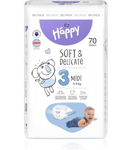 Bella Baby Happy Soft&Delicate; Size 3 Midi, 70 pc, Disposable Nappies For Kids, A baby with a dry bum is a happy baby! Bella Baby Happy Soft&Delicate; Size 3 Midi disposable nappies will keep your child comfortable all day and all night and keep their bottom nice and dry, so that you can enjoy every moment together without any worries. Characteristics: quick absorption for a dry feeling soft surface prevents leakage moisture indicator lets you know when you need to change the nappy elastic fastening strips extra breathable material dermatologically tested – suitable for newborns and sensitive skin free of allergens ...