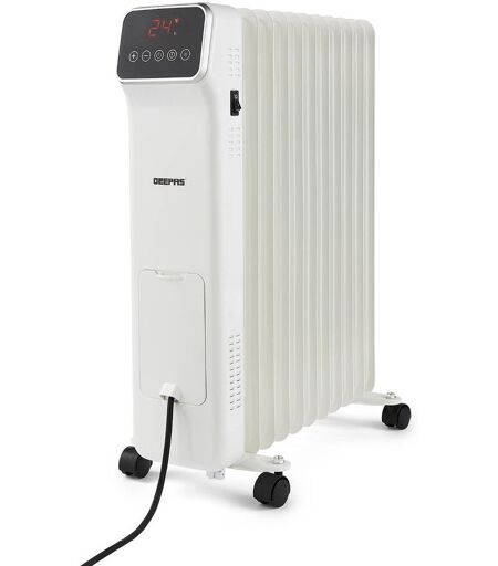 Turn cold winter nights into moments of comfort with the Geepas Oil Filled Radiator Heater. Designed with fins, a smart thermostat, and three power modes, it spreads warmth evenly and efficiently across your home. The LED display and remote make it easy to adjust settings without leaving your seat, while built-in safety features like tip-over and overheat protection give you complete peace of mind. Portable, silent, and energy-conscious, this sleek black radiator is the perfect blend of style, safety, and performance – keeping your family cozy, night after night. • Maintains steady warmth to prevent chills and colds. • Gentle heating helps relieve muscle and joint stiffness. • Keeps the room cosy without drying out skin or eyes. • Supports better respiratory comfort compared to fan heaters. • Reduces nighttime chills, promoting restful sleep. • Silent operation lowers stress and improves relaxation. • Even heat distribution helps avoid sudden temperature shocks. • Creates a comfortable environment for children and elderly. • Prevents dampness and mould growth that can harm health. • Energy-efficient warmth reduces fatigue caused by fluctuating cold. heater radiator radiators heaters portable electric oil filled free standing space room car for home low energy bathroom smart silent efficient with thermostat and timer plug in burner wall mounted small oil-filled Geepas Finish: White, Power (Wattage): 2500W, Size: 52.80"H x 15.80"W x 79"D ...