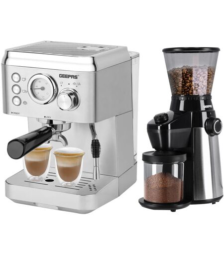 Geepas 1140W Espresso & Cappuccino Coffee Machine & Conical Burr Coffee Grinder Combo Set- Milk Frother, Coffee Grinder With 15 Precise Settings Silver;Black 1.8L