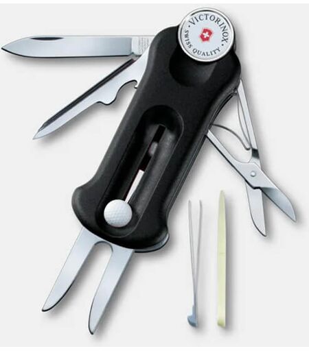Elevate your performance and reduce your handicap with the Victorinox Golf Tool Black – the perfect companion for a fantastic day on the course. Use the tee punch to easily tee up, even on hard or frozen ground. Repair the green with the built-in repair tool, and slide out the ball marker whenever you need it. Repeat these steps until you surpass your best score! Tools: Ball marker / Blade, large / Bottle opener / Groove cleaner / Nail file / Scissors / Repair tool / Tee punch / Toothpick / Tweezers Dimensions: 1.6(H) x 9.1(L) x 3.6(W) cm. Weight: 0.064kg. The Victorinox Golf Tool Black is covered by a Victorinox lifetime warranty. Knives are not for sale to persons under the age of 18. - all knives and bladed products are delivered by Age Verified Delivery (AVD). The carrier may request proof of age in order to deliver your parcel. If proof of age is not available, or the recipient is underage, the carrier will refuse to deliver. ...