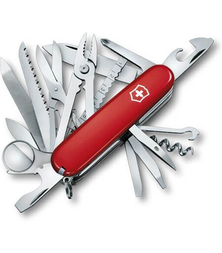 The Victorinox Swiss Army Knife Swiss Champ pocket knife is the culmination of over 100 years of expertise since the introduction of the legendary Officer's knife. This ultimate pocket knife features an impressive 33 functions and offers countless possibilities. No matter where you are or what challenges you face, if something can be fixed, the Swiss Champ can handle it. Tools: Blade, large / Blade, small / Bottle opener / Can opener / Chisel 4mm / Combination pliers / Corkscrew / Fish scaler / Hook disgorger / Keyring / Magnifying glass / Metal file / Metal saw / Mini screwdriver 1.5mm / Multipurpose hook / Nail cleaner / Nail file / Phillips screwdriver 1/2 / Pin / Pressurised ballpoint pen / Reamer, punch and sewing awl / Ruler (cm) / Ruler (in) / Scissors / Screwdriver 2.5mm / Screwdriver 3mm / Screwdriver 6mm / Toothpick / Tweezers / Wire crimper / Wire cutter / Wire stripper / Wood saw Dimensions: 3.3(H) x 9.1(L) x 2.6(W) cm. Weight: 0.185kg. The Victorinox Swiss Army Knife Swiss Champ is covered by a Victorinox lifetime warranty. Knives are not for sale to persons under the age of 18. - all knives and bladed products are delivered by Age Verified Delivery (AVD). The carrier may request proof of age in order to deliver your parcel. If proof of age is not available, or the recipient is underage, the carrier will refuse to deliver. ...